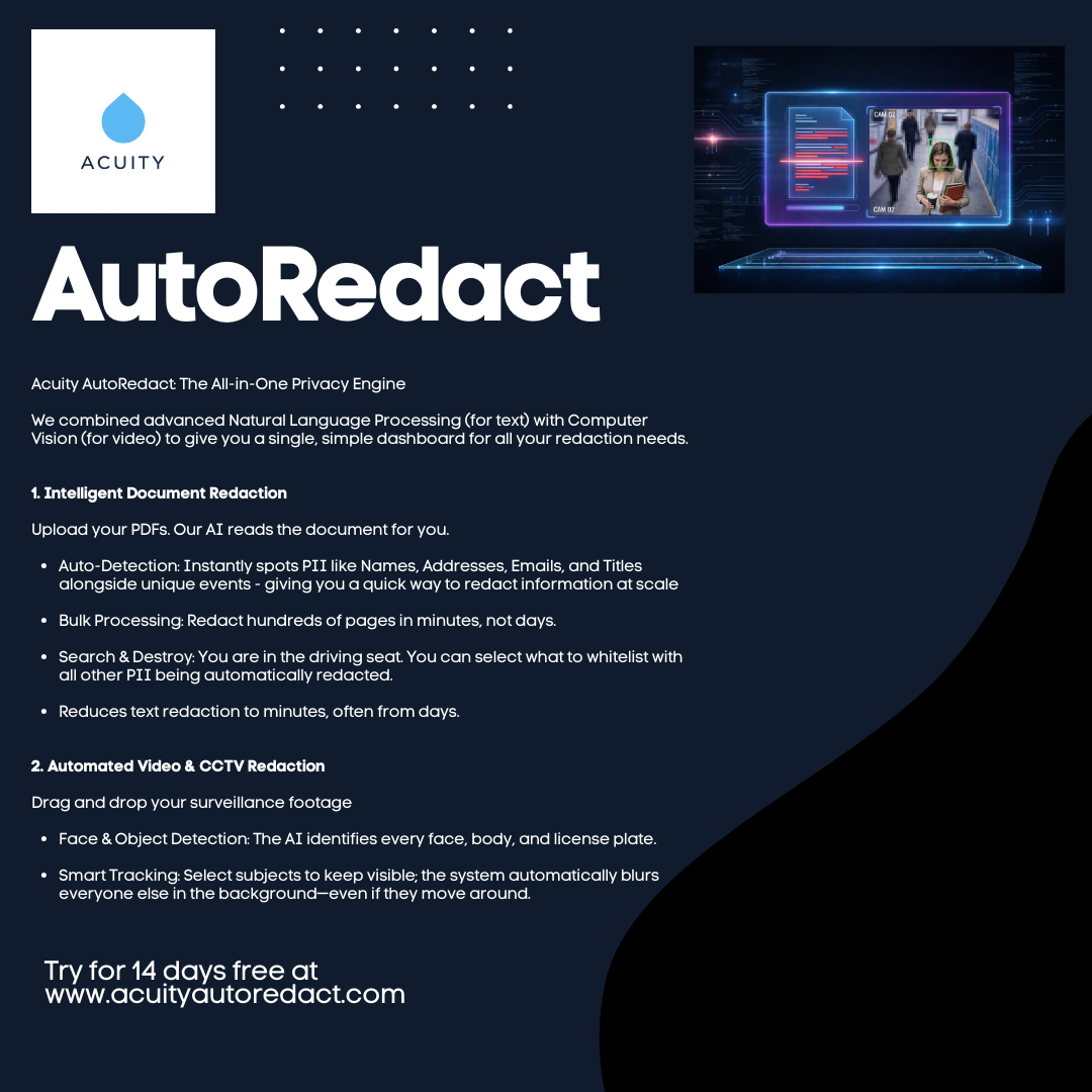 The UK’s only £21/mo automated redaction tool optimised to speed up Subject Access Request Redaction for Schools. Blur faces in CCTV & redact PDFs instantly. No training required. Data processing entirely in the UK and EU. Start Free Trial at https://www.acuityautoredact.com/