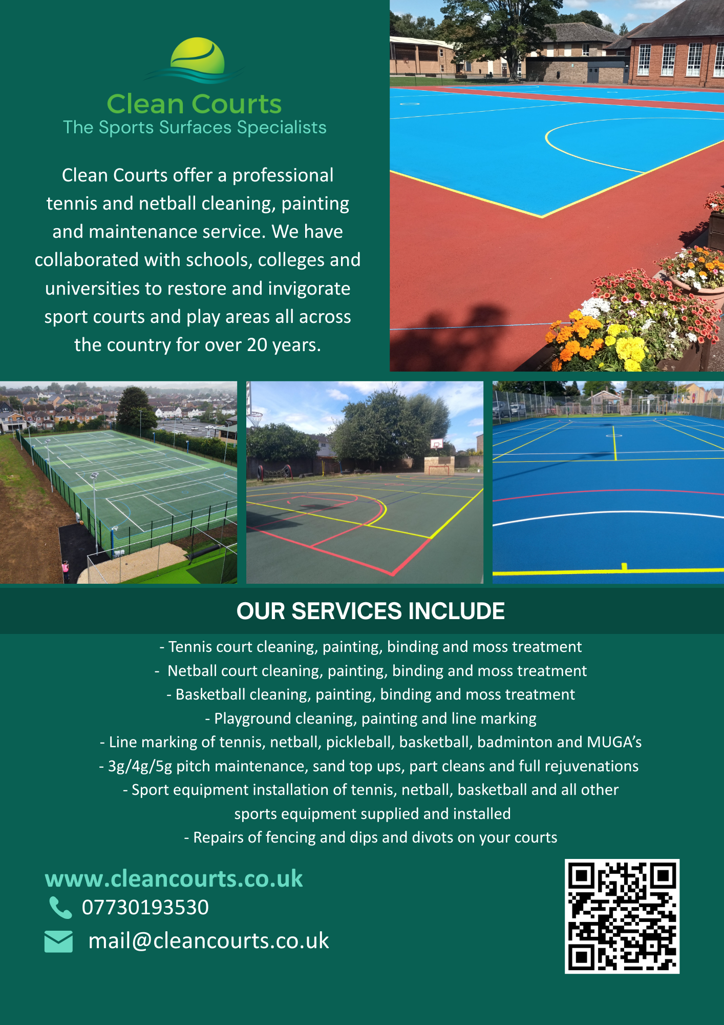 Clean Courts – The Sports Surface Specialists Clean Courts offer a professional tennis court and sports surface cleaning, painting and maintenance service. Our services include: – part or full cleaning, re-sanding and refurbish of artificial grass courts, 3G/4G/5G pitches – line marking of tennis, netball, pickleball, basketball and MUGA’s – installation of new nets, posts and fences – repairs of fencing and dips and divots on your courts
